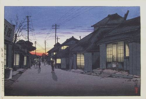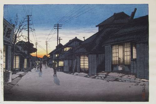 (in Japanese, "(Hakubo) Choshi-machi Imamiya-dori"), and was first published and printed in 1932. It depicts a beautiful twilight image of a