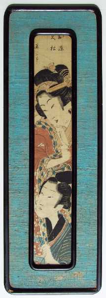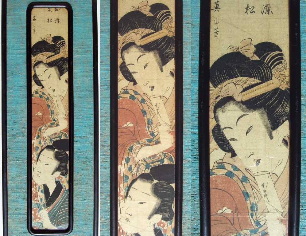 Courtesan above clutches a folded love letter--as her suitor pulls on the sleeve of her kimono. Rarely seen