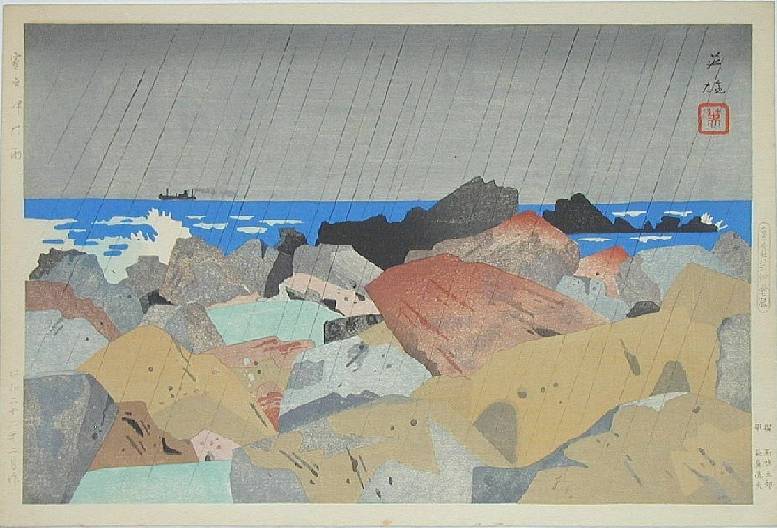 Fine. Nicely executed "bokashi" shading; nice over-printed streaks of falling rain. |