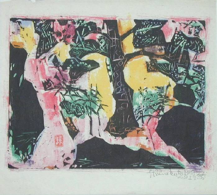An attractive, bold "sosaku hanga" image. Commissioned by Yasukawa Electric Corp. as a "calendar print." |
