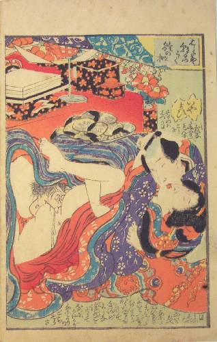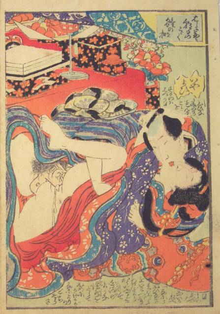 In front of a decorated table, we view a detailed look of the genitals of this couple locked in a love-making embrace. (Quite clean for "shunga.") |