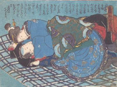 Under heavy blankets on a blue futon, this couple is seen engaged in love-making. A wonderful "shunga" print in exceptional condition. |