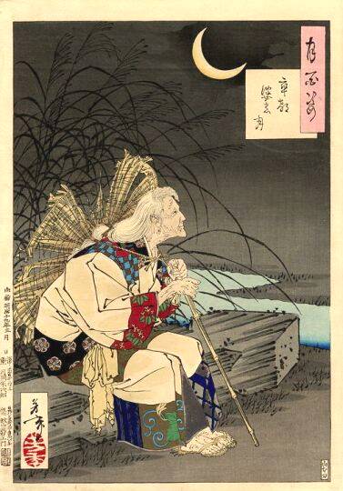 Hauntingly beautiful image. Komachi, the famous beauty and poetess of the 9th century, is seen later in life having become an old begger woman as she reflects upon the passing of her earlier beauty and fortunes. |