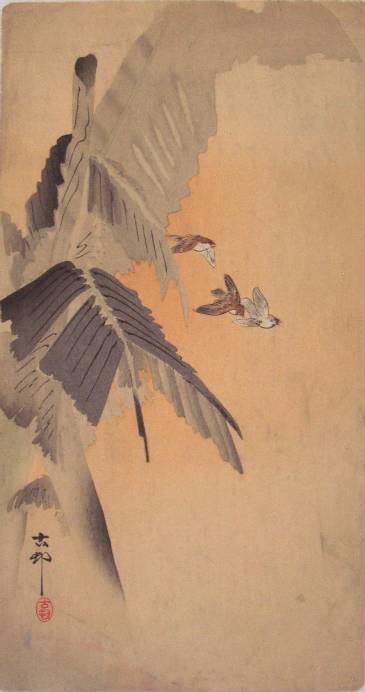 Three colorful tree swallows in flight under the leaves of a banana tree. PRE-1923 earthquake (note: Daikoku-ya Publisher ceased business in 1923). |
