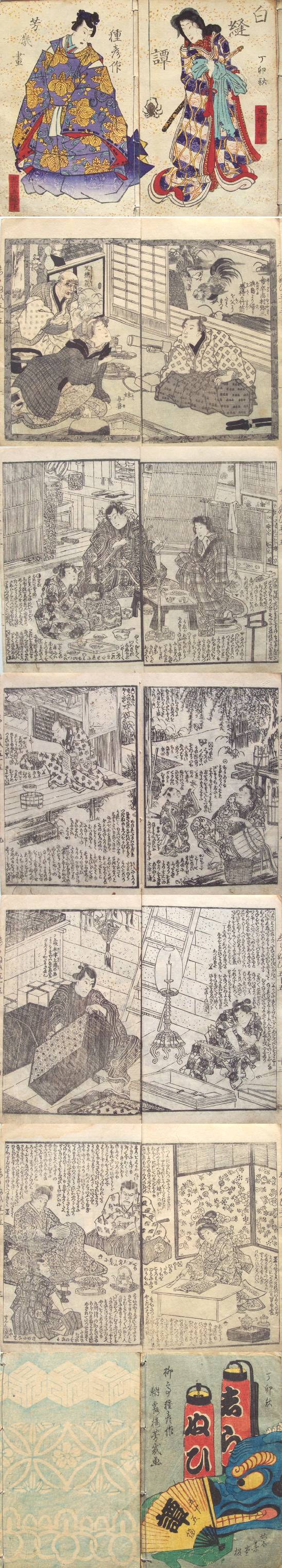 Beautiful matching set of manga--the covers of which match up to form an attractive diptych composition. Inside, over 40 pages of black-lined woodblocks, mostly diptychs, with text. Exceptionally fine condition. |