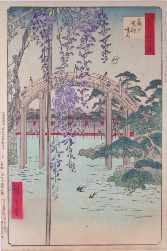 Excellent. Skillfully executed "bokashi" shading to upper/lower sky, wisteria, stonework, water area, and title cartouche; visible woodgrain to sky and water; highly detailed carving. |