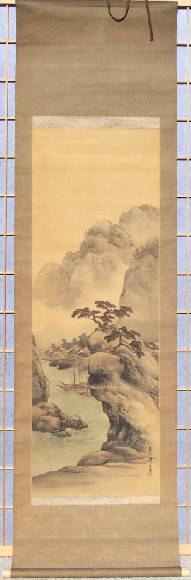 An attractive painting of a rocky gorge setting, with sailboat and small village below--nicely mounted as a hanging scroll. A unique, true one-of-a-kind artwork. |