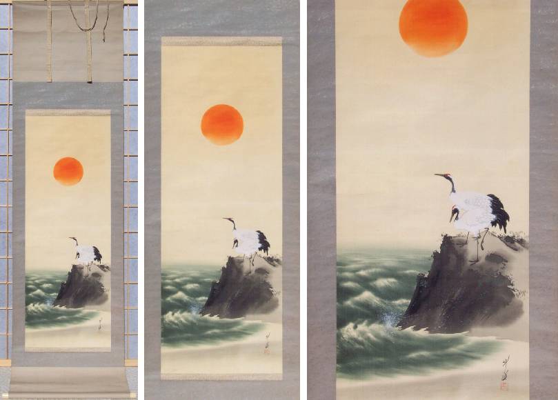A striking painting of two herons atop a rock; with waves splashing below and red sun overhead--nicely mounted as a hanging scroll. A unique, true one-of-a-kind artwork. Stored inside Japanese hand-made wooden box (not original). |