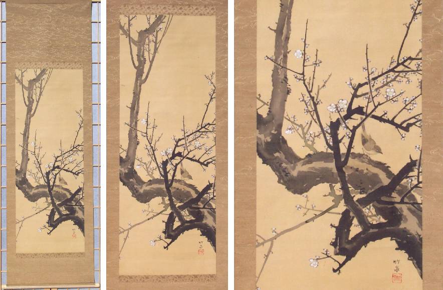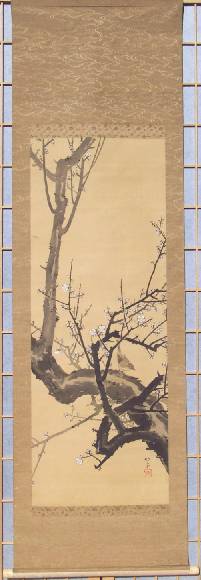 A nicely executed painting of a flowering plum tree, with tiny nightingale perched on a branch--nicely mounted as a hanging scroll. A unique, true one-of-a-kind artwork. |