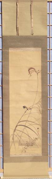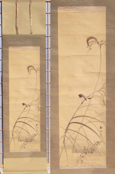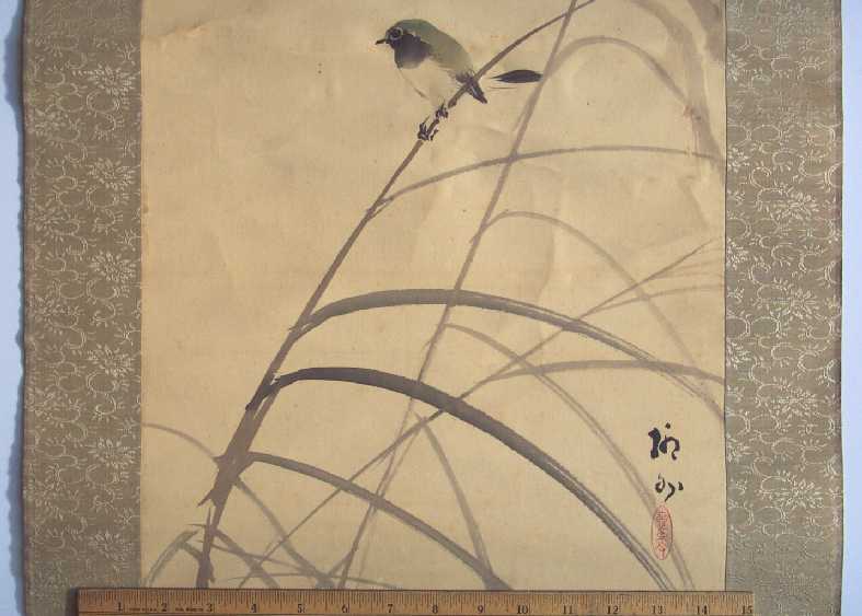 A delicately executed painting of a colorful sparrow, perched on a pampass grass--nicely mounted as a hanging scroll. A unique, true one-of-a-kind artwork. (Painting itself may be older and re-mounted.) |
