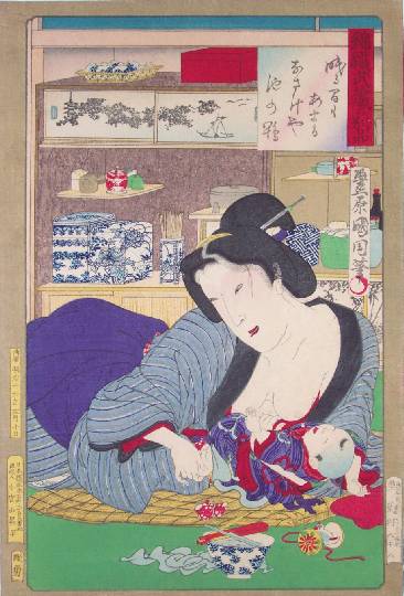 Very Fine. Nicely done "bokashi" shading to face, baby's head,cartouche, and background; burnishing to black collar, sleeves, and hair-pin; light "gauffrage" to sliding doors; highly detailed carving. |