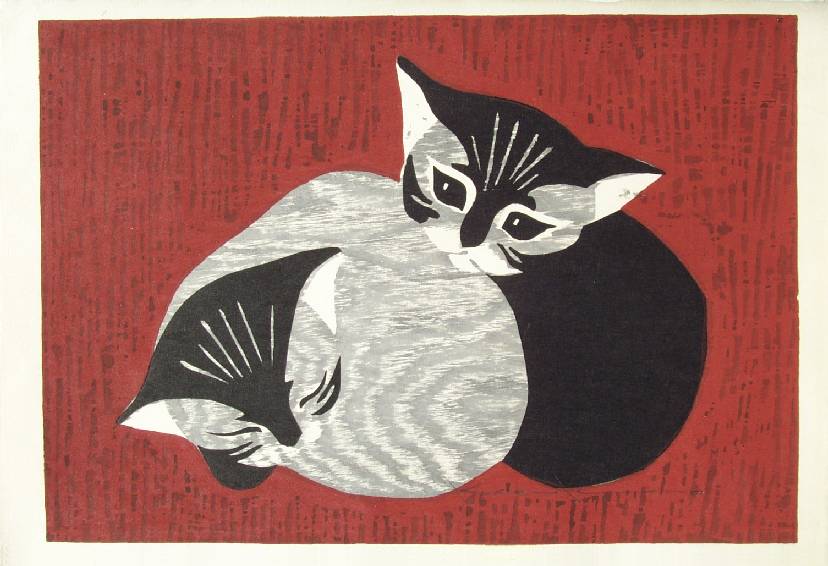Very Fine. Bold, fresh colors; on heavy, handmade paper. Nicely visible woodgrain pattern to grey cat. Cats' outlined in thin lacquer line. |