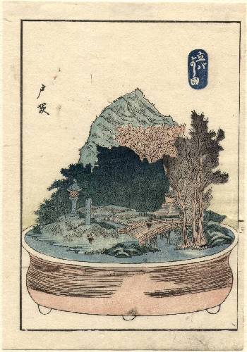 From an early "e-hon" (book) titled "Fifty-three Stations of the Tokaido as Bonsai," picturing each of the 53 Stations as a miniture landscape in a ceramic tray (known as "bonkei"). |