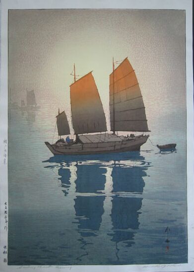 Very large ("double-oban") beautiful Yoshida "sailboat image." Seldom seen--impressively large format and difficult to print. This is the "brilliantly backlit background 'Morning' version (with distant boats left);" five other variant states exist for this image (using different colors). |