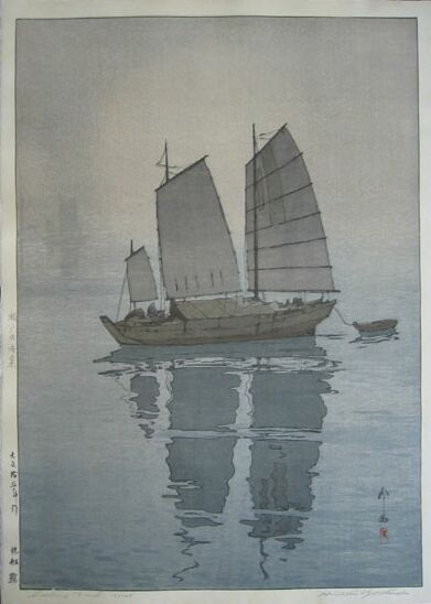 Very large ("double-oban") beautiful Yoshida "sailboat image." Seldom seen--impressively large format and difficult to print. This is the "greyish background 'Mist' version" (with distant, faint sailboats left); five other variant states exist for this image (using different colors). |