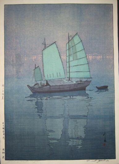 Very large ("double-oban") beautiful Yoshida "sailboat image." Seldom seen--impressively large format and difficult to print. This is the "dark bluish-green background 'Night' version" (with distant sailboats left); five other variant states exist for this image (using different colors). |