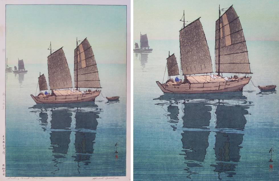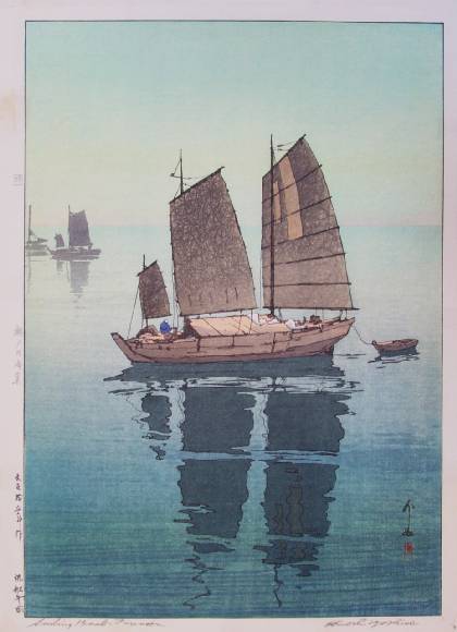 Very large ("double-oban") beautiful Yoshida "sailboat image." Seldom seen--impressively large format and difficult to print. This is the "light blue background 'Forenoon' version (with distant boats left);" five other variant states exist for this image (using different colors). |