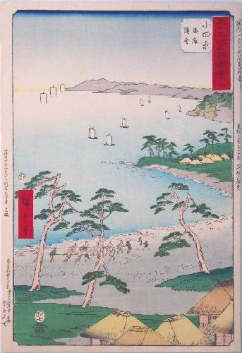 Fine. Skillfully executed "bokashi" shading to upper/lower sky, rooftops, beach area, and title cartouche; highly detailed carving. |