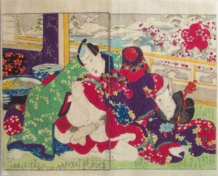 Before a snow-laden backdrop--a couple is seen locked in a love-making embrace. (Exceptionally clean for "shunga.") |