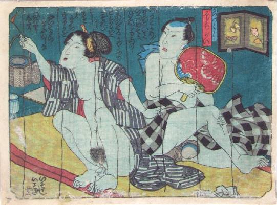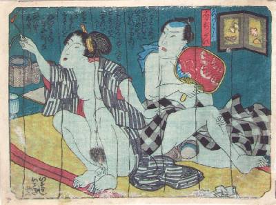 Under a netting, this courtesan is seen reaching towards a mosquito with a burning stick. A wonderful "shunga" print in exceptional condition. |