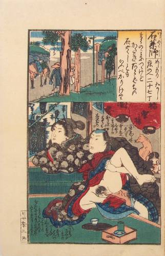 A shunga scene--set against a "Fifty-Three Stations of the Tokaido" station pictured above. |
