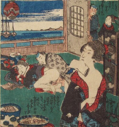 A shunga scene--from a "Fifty-Three Stations of the Tokaido" shunga series. Guaranteed original. |