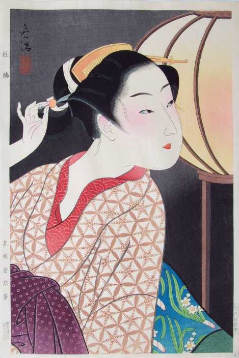 One of the splendid "bijin-ga" designs of the "shin-hanga" period--a young beauty seen before a Japanese lantern ("andon") as she listens intently to the distant call of a cuckoo. A rarely see print. |
