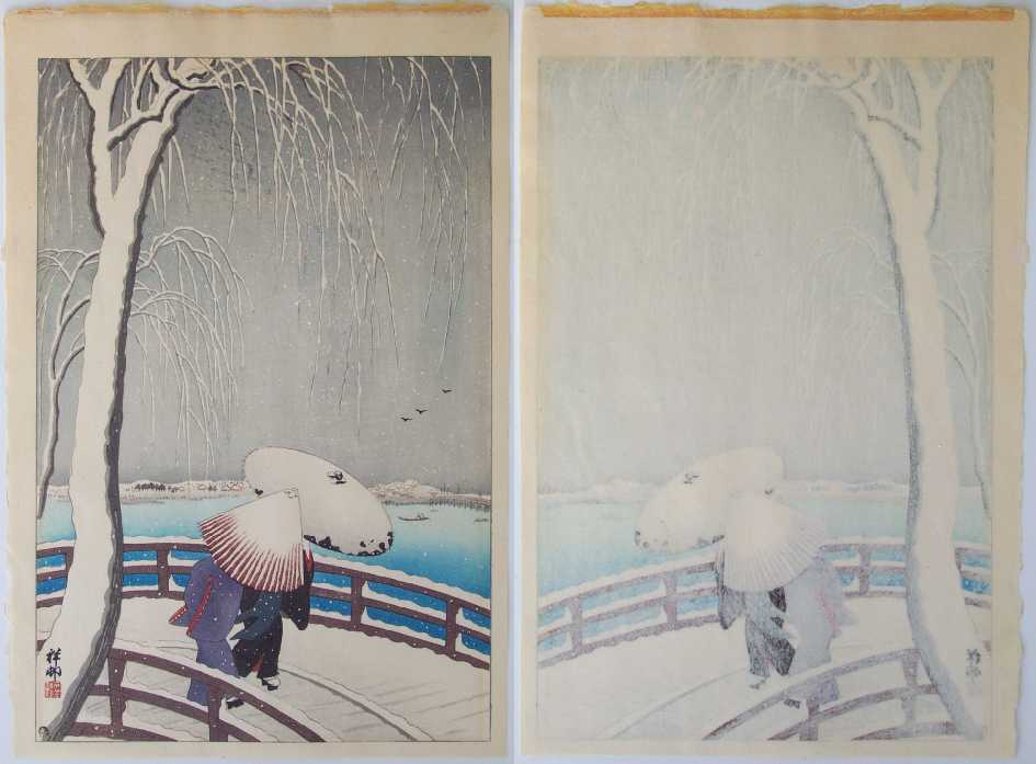 accumulation and bridge boards; over-splashed "gofun" snow; crisp lines, highly detailed. |