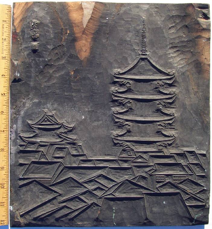 Full-sized "chuban" woodblock (old remnants of "hanshita" still attached to upper area). Quite an unusual find. An early, hand-carved cherrywood woodblock--Taisho or early Showa period carving. Seldom available. |
