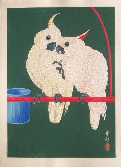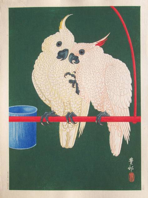 "Two White Cockatoos on a Red Bar" |