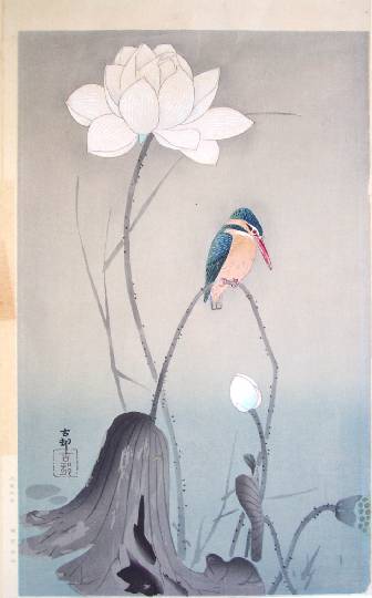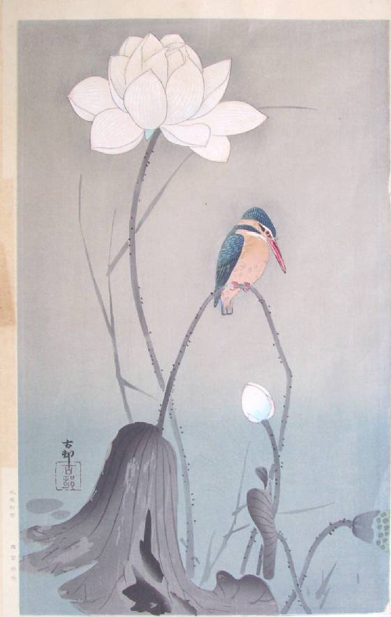 Colorful little kingfisher perched on a bent stem with white lotus flower behind. (Note: Pre-War; bears "signature" deleted on later printings.) |