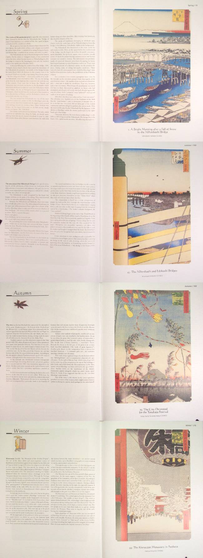 Authoritative reference on Hiroshige’s finest series of 118 prints, “One Hundred Famous Views of Edo” issued between 1856-58. Illustrated entirely in color, this outstanding reference shows each of Hiroshige's prints reproduced in nearly full size. Arranged seasonally (as prints of Spring, Summer, Autumn, and Winter), each full-page plate is the accompanied with an extensive commentary about each print’s location and history; plus a 12 page Introduction detailing the series. |