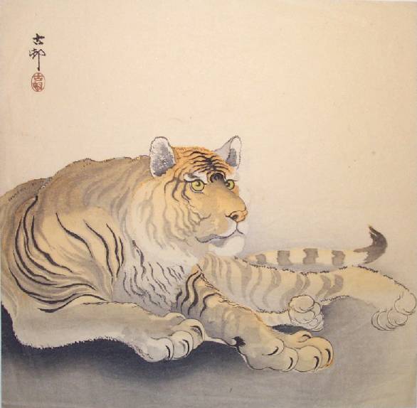 Very Fine. Superbly executed "bokashi" shading; "gauffrage" to tiger's wiskers; crisp lines, highly detailed. |