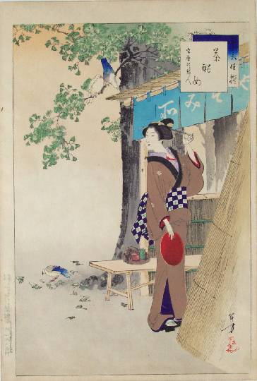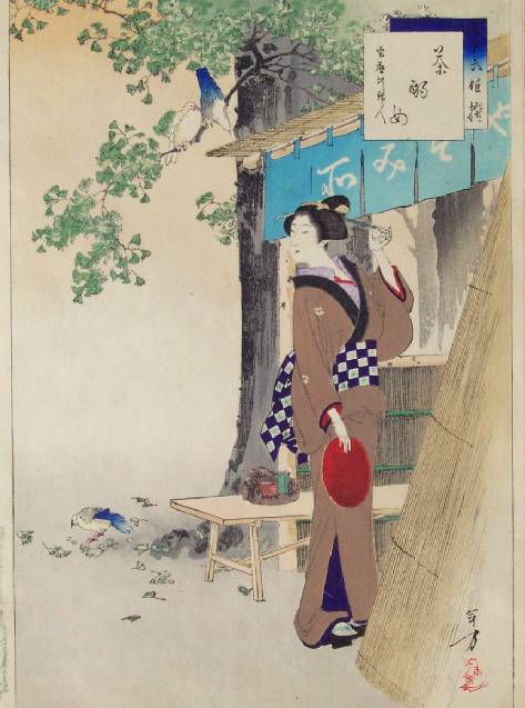 Colorful and skillfully printed "bijin-ga" image of teahouse maid under a ginko tree. |