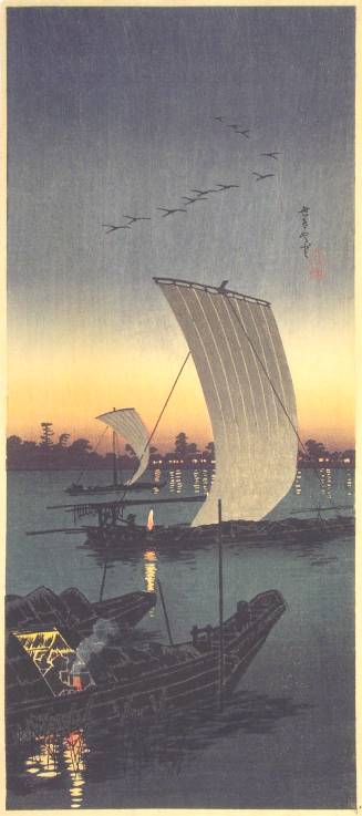 Very Fine. Wonderfully executed "bokashi" shading throughout; nicely visible woodgrain to sky; white "gofun" pigments lightly over-printed as smoke; crisply and highly detailed carving. |