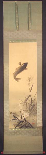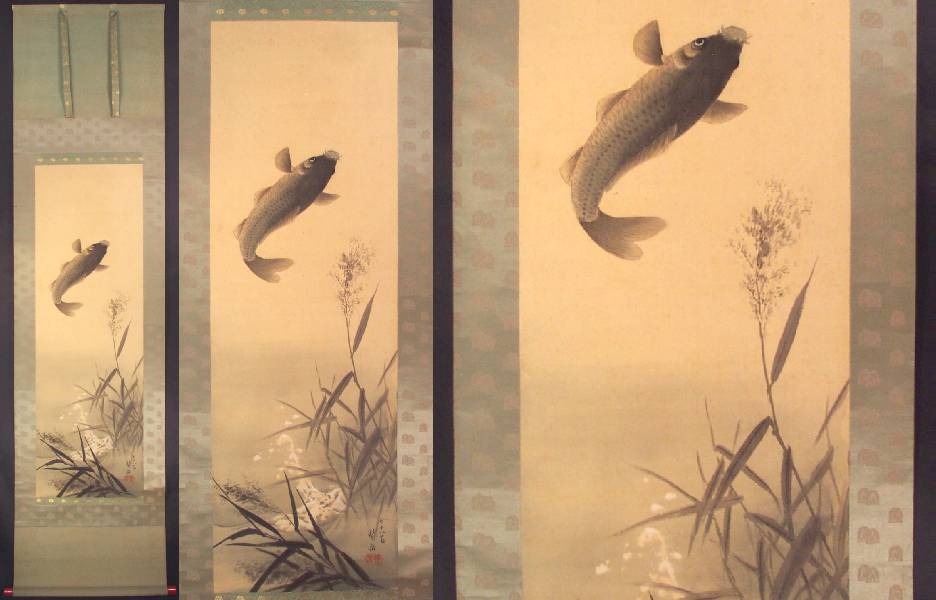 A very attractive painting of an air-born carp, leaping high above the reeds--nicely mounted as a hanging