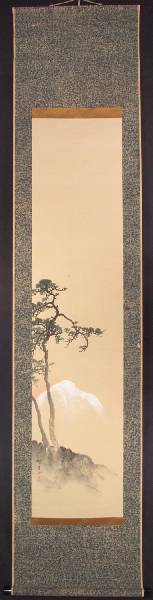 Painting itself is of black, grey, green, soft red "sumi" and white "gofun" on light tan paper. |