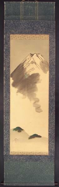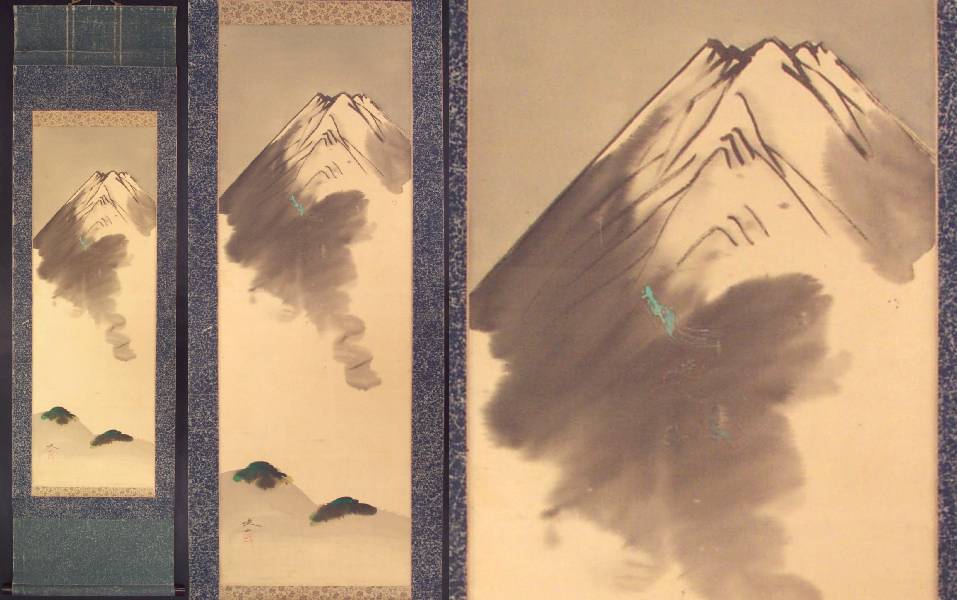 An attractively painted and bold rendering of Mt Fuij, with a faintly painted torquoise dragon seen against the lower brown flank--nicely mounted as a hanging