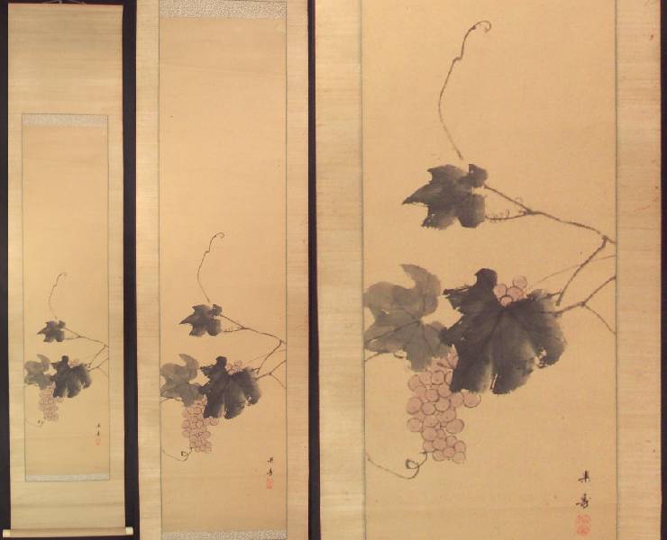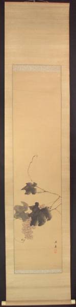 A wonderfully composed "sumi-e" painting of late-summer grapes still on the vine--nicely mounted as a hanging