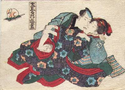 The zodiac symbol of a rabbit is seen as inset. A wonderful "shunga" print in quite nice condition. |
