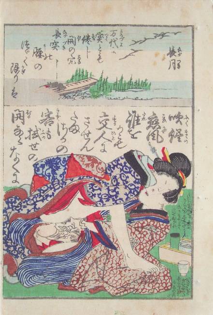 From a 3-volume shunga set titled "Thirty-six Poems"--we view a couple engaged in love-making. (Exceptionally clean for "shunga.") |