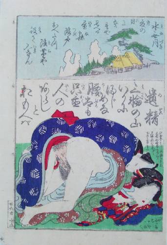 From a 3-volume shunga set titled "Thirty-six Poems"--we view a couple engaged in love-making. (Exceptionally clean for "shunga.") |