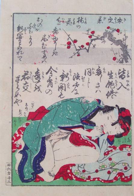 From a 3-volume shunga set titled "Thirty-six Poems"--we view a couple engaged in love-making. (Exceptionally clean for "shunga.") |