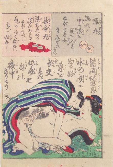 From a 3-volume shunga set titled "Thirty-six Poems"--we view a couple engaged in love-making. (Exceptionally clean for "shunga.") |