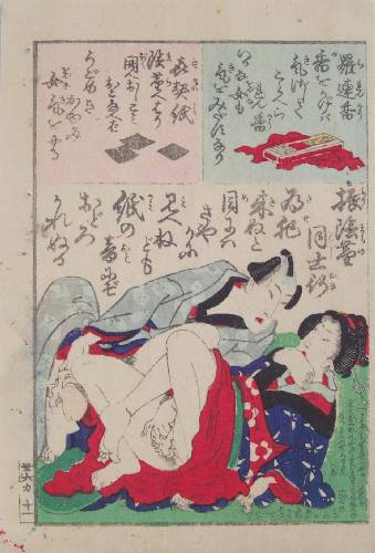 From a 3-volume shunga set titled "Thirty-six Poems"--we view a couple engaged in love-making. (Exceptionally clean for "shunga.") |