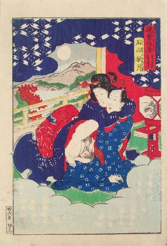 From a 3-volume shunga set titled "Thirty-six Poems"--we view a couple engaged in love-making. (Exceptionally clean for "shunga.") |