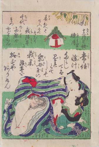 From a 3-volume shunga set titled "Thirty-six Poems"--we view a couple engaged in love-making. (Exceptionally clean for "shunga.") |