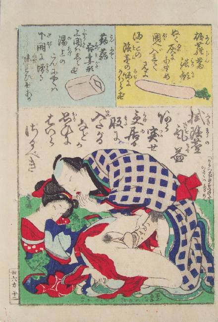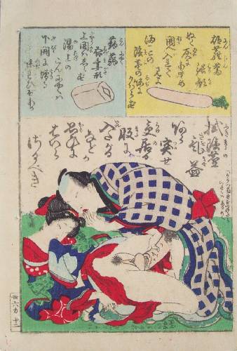 From a 3-volume shunga set titled "Thirty-six Poems"--we view a couple engaged in love-making. (Exceptionally clean for "shunga.") |
