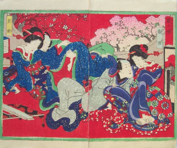 From a 3-volume shunga set titled "Thirty-six Poems"--we view a two couples engaged in love-making. (Exceptionally clean for "shunga.") |