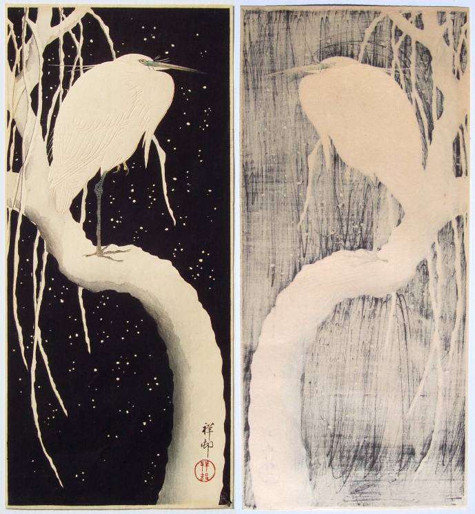 Unquestionably Koson's finest "kacho-e" image. Quoting: "Richard Illing describes the print as 'a masterpiece of graphic art'....one of the most highly valued designs by Koson." Rarely available--quite nice condition. |
